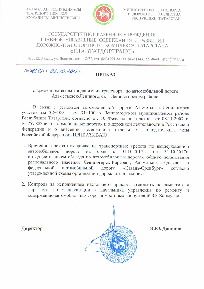 О временном закрытии движения транспорта по автомобильной дороге Альметьевск-Лениногорск.