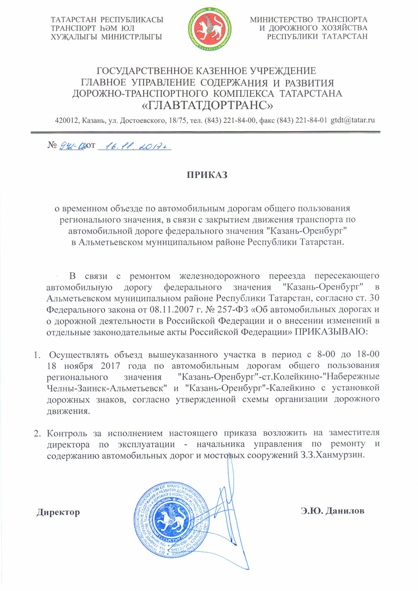 Об организации временного объезда участка дороги федерального значения "Казань-Оренбург" в Альметьевском муниципальном районе Республики Татарстан.