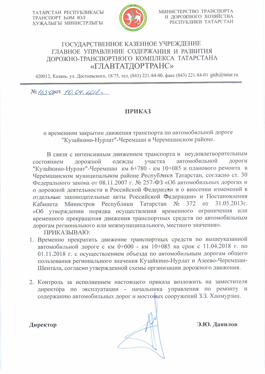 О временном закрытии движения транспорта по автомобильной дороге "Кузайкино-Нурлат"-Черемшан.