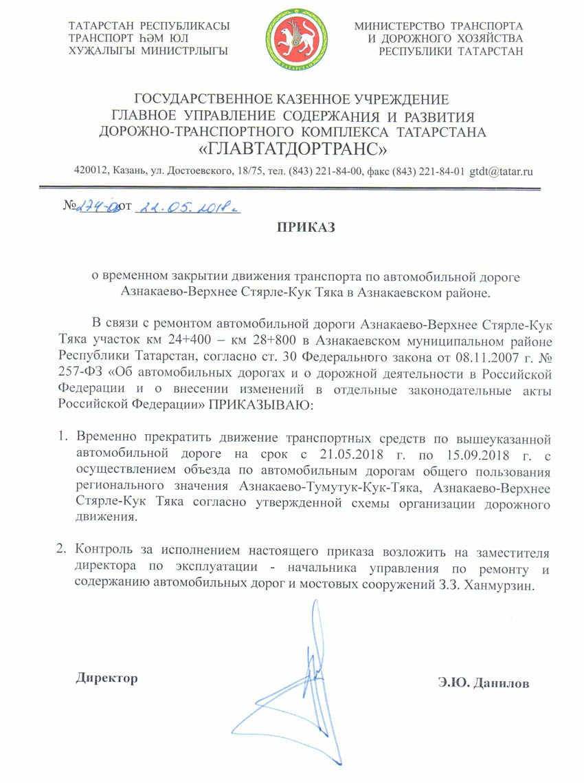 О временном закрытии движения транспорта по автомобильной дороге Азнакаево-Верхнее Стярле-Кук Тяка.