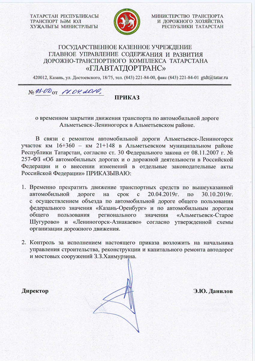 О временном закрытии движения транспорта по автомобильной дороге Альметьевск-Лениногорск.