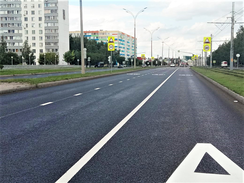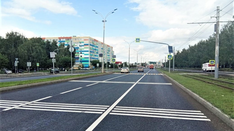 Кроме этого, выполнено обустройство трамвайных переездов резиновым настилами, появились новая остановочные площадки. Что касается организации дорожного движения, то в целях безопасности участников движения перед основными перекрестками на проезжей части нанесена разметка с шумовыми полосами, светильники выполнены в светодиодном решении. Также выполнено устройство дополнительных опор наружного освещения, на тех участках, где была необходимость. Проектирощик: АО «Комплекспроект». Генподрядная организация АО "Трест Камдорстрой".
