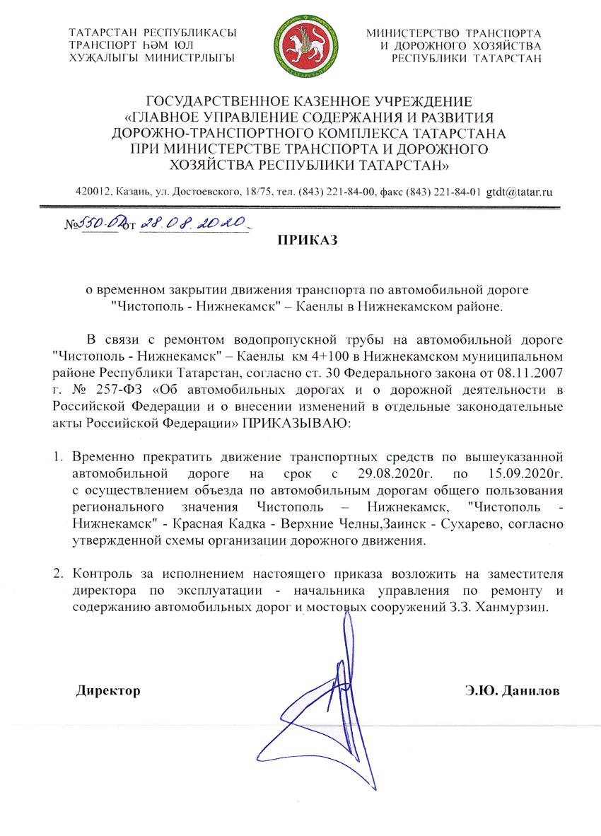 О временном закрытии движения транспорта по автомобильной дороге "Чистополь - Нижнекамск" – Каенлы.