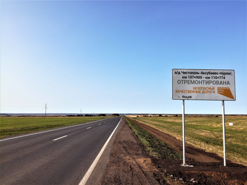 Завершены работы по ремонту участка км 107+900 ‒ км 110+774 автомобильной дороги «Чистополь ‒ Аксубаево ‒ Нурлат» в Нурлатском муниципальном районе Республики Татарстан. Ремонт выполнен в рамках национального проекта «Безопасные и качественные автомобильные дороги». В ходе ремонта были выполнены работы по замене асфальтобетонного покрытия, укреплению обочин, установке сигнальных столбиков, новых дорожных, а также работы по нанесению дорожной разметки.