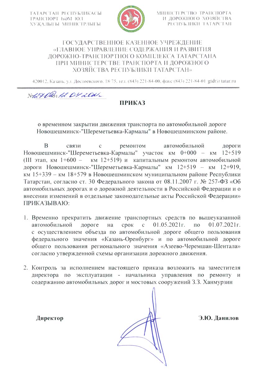 О временном закрытии движения транспорта по автомобильной дороге Новошешминск-"Шереметьевка-Кармалы".