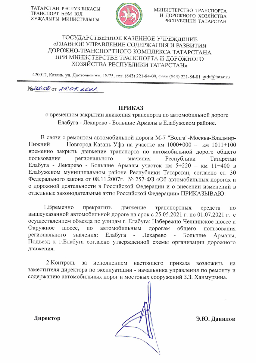 О временном закрытии движения транспорта по автомобильной дороге Елабуга - Лекарево - Большие Армалы.