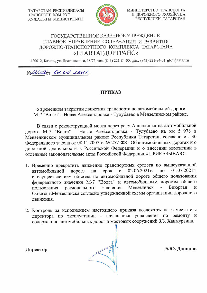 О временном закрытии движения транспорта по автомобильной дороге М-7 "Волга" - Новая Александровка - Тулубаево.