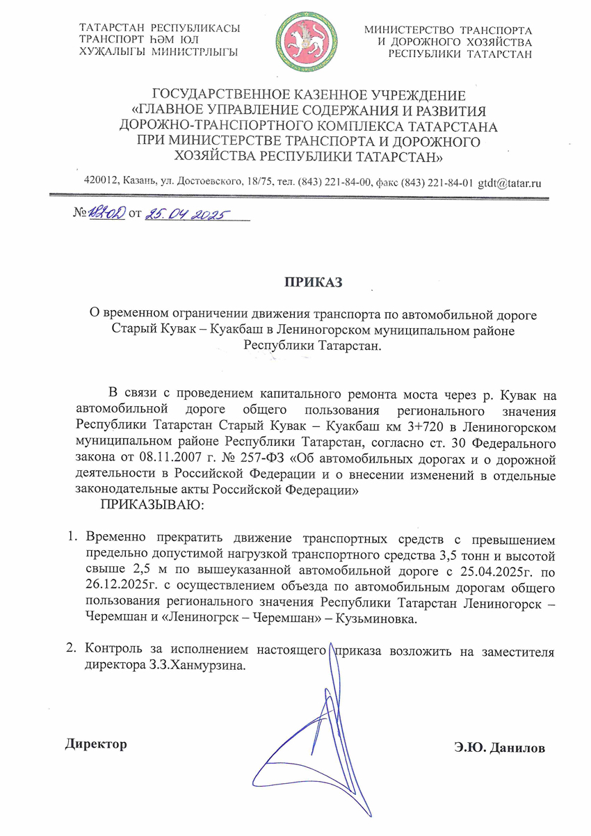 О временном ограничении движения транспорта по автомобильной дороге Старый Кувак – Куакбаш
