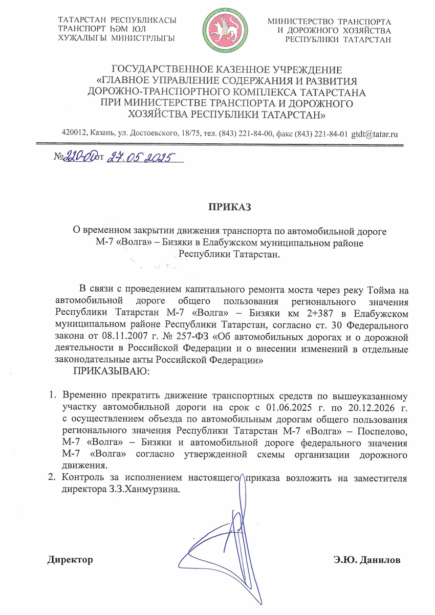 О временном закрытии движения транспорта по автомобильной дороге М-7 «Волга» – Бизяки