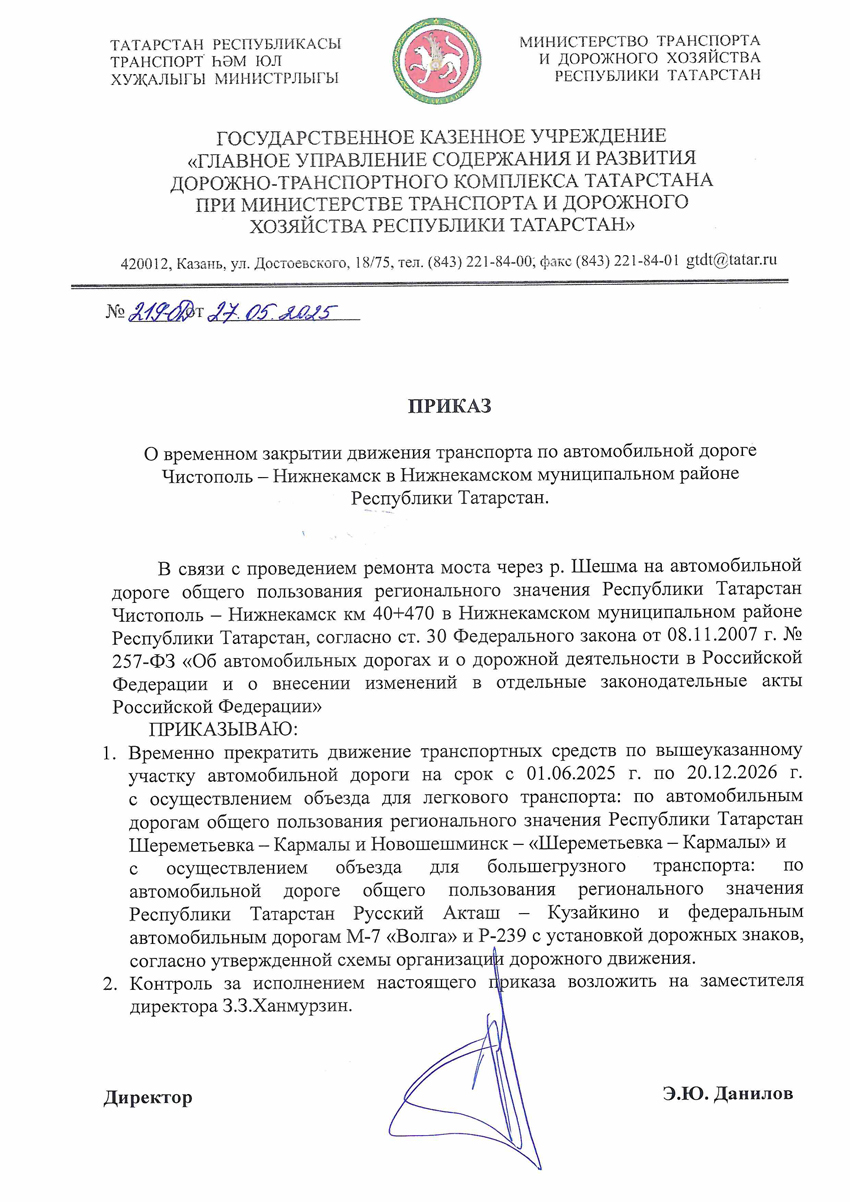 О временном закрытии движения транспорта по автомобильной дороге Чистополь – Нижнекамск