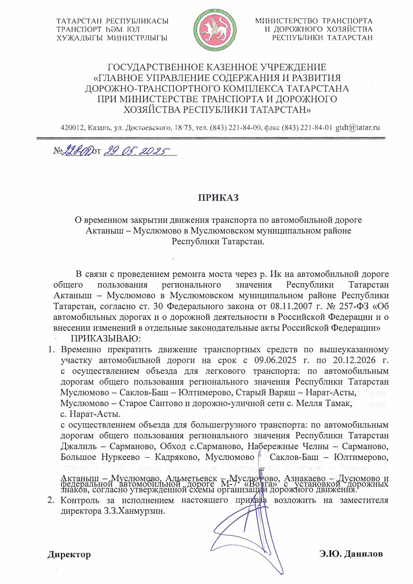 О временном закрытии движения транспорта по автомобильной дороге Актаныш – Муслюмово