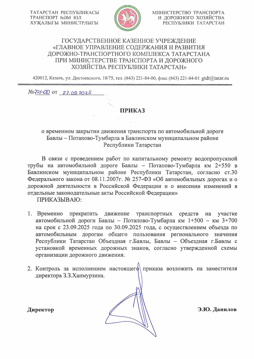 О временном закрытии движения транспорта по автомобильной дороге Бавлы – Потапово-Тумбарла