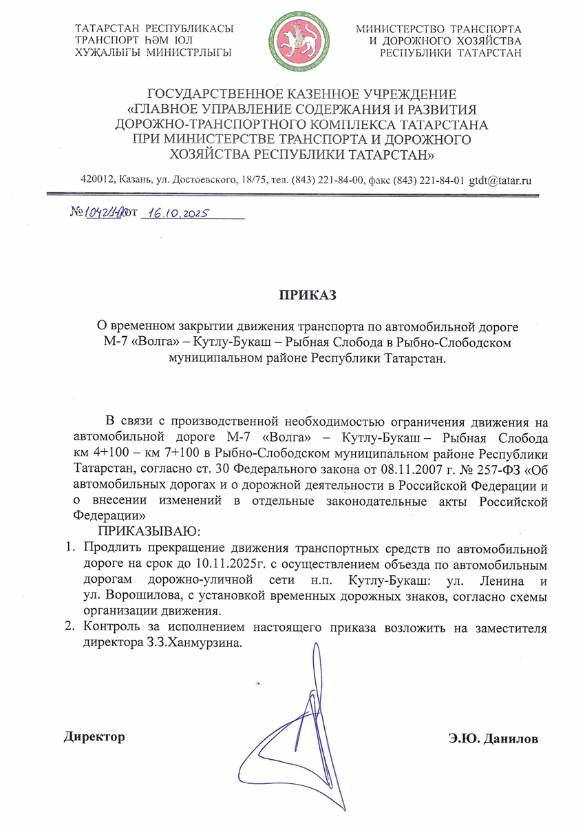 О временном закрытии движения транспорта по автомобильной дороге М-7 «Волга» – Кутлу-Букаш – Рыбная Слобода
