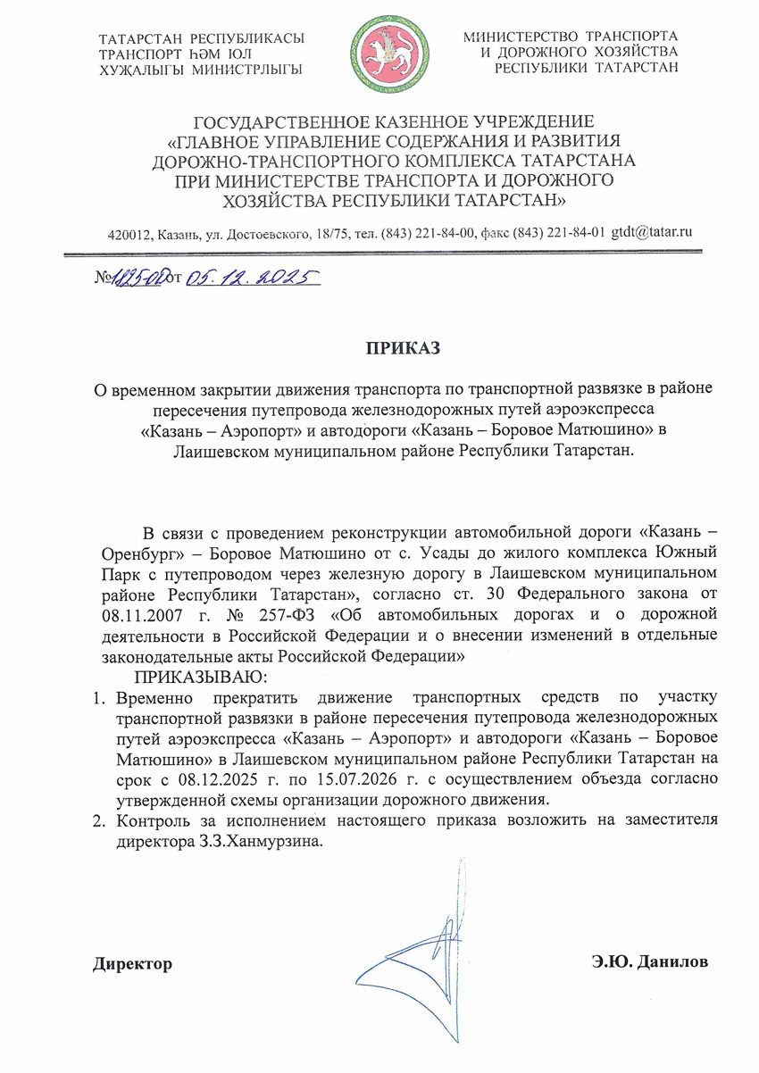 О временном закрытии движения транспорта по транспортной развязке в районе пересечения путепровода железнодорожных путей аэроэкспресса «Казань – Аэропорт» и автодороги «Казань – Боровое Матюшино»