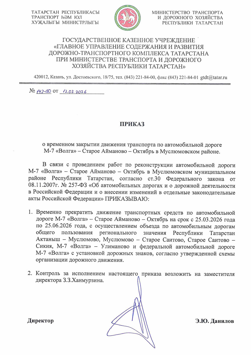О временном закрытии движения транспорта по автомобильной дороге М-7 «Волга» – Старое Айманово – Октябрь