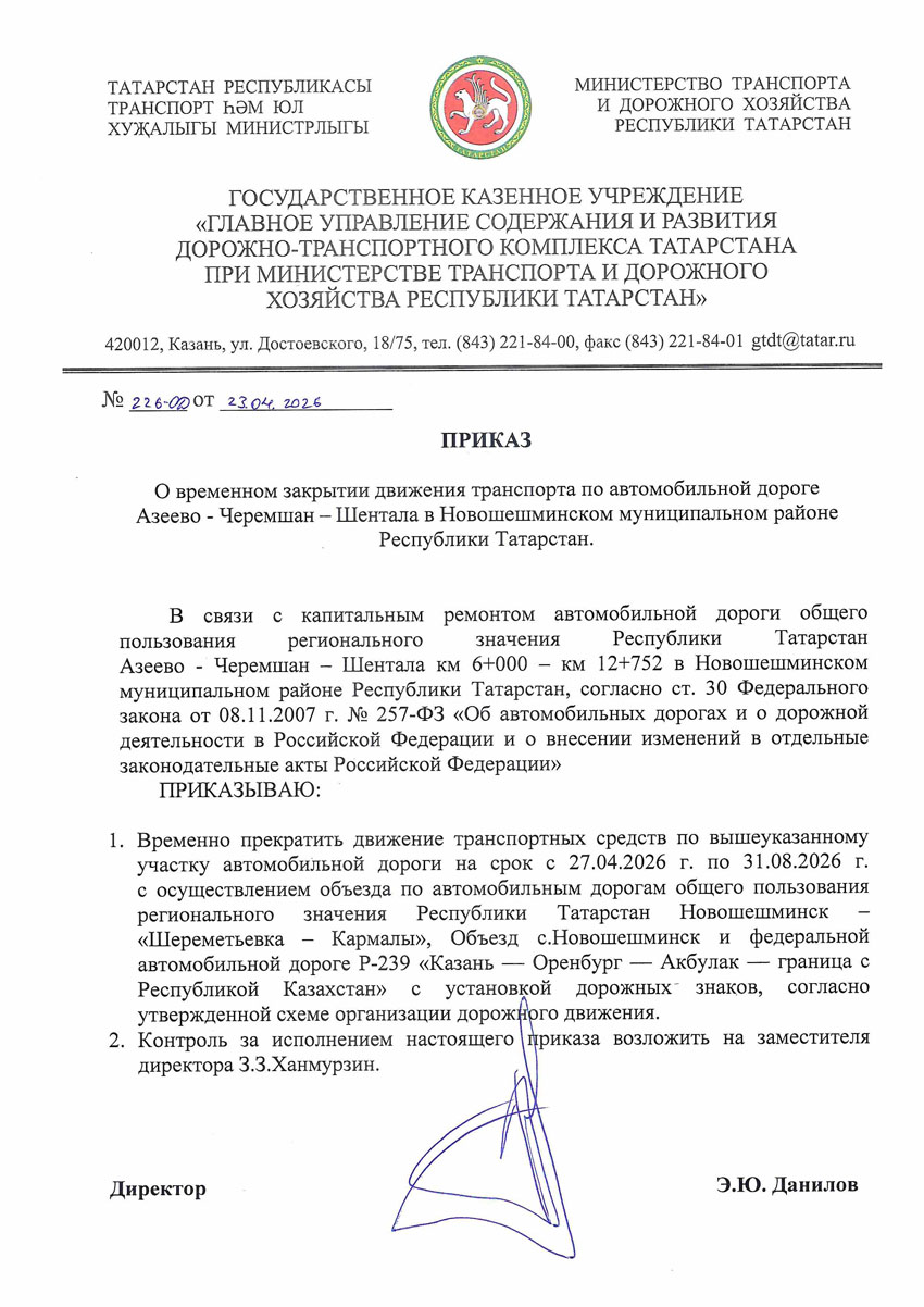 В связи с проведением капитального ремонта на автомобильной дороге общего пользования регионального значения Республики Татарстан Базарные Матаки – Болгар км 0+214 – км 3+781 в Алькеевском муниципальном районе Республики Татарстан временно прекращается движение транспортных средств по вышеуказанному участку автомобильной дороги на срок с 27.04.2026 г. по 31.08.2026 г.