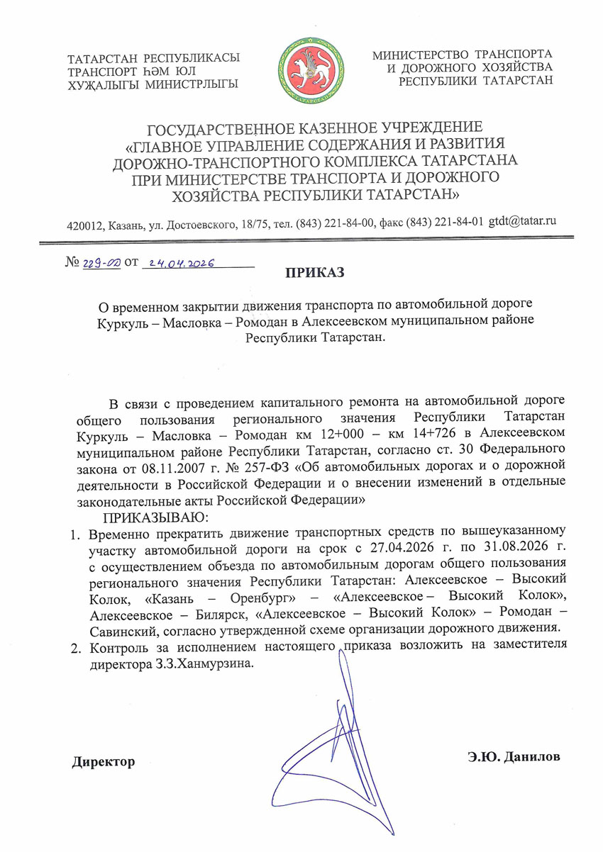 В связи с проведением капитального ремонта на автомобильной дороге общего пользования регионального значения Республики Татарстан Куркуль – Масловка - Ромодан км 12+000 – км 14+726 в Алексеевском муниципальном районе Республики Татарстан временно прекращается движение транспортных средств по вышеуказанному участку автомобильной дороги на срок с 27.04.2026 г. по 31.08.2026 г.
