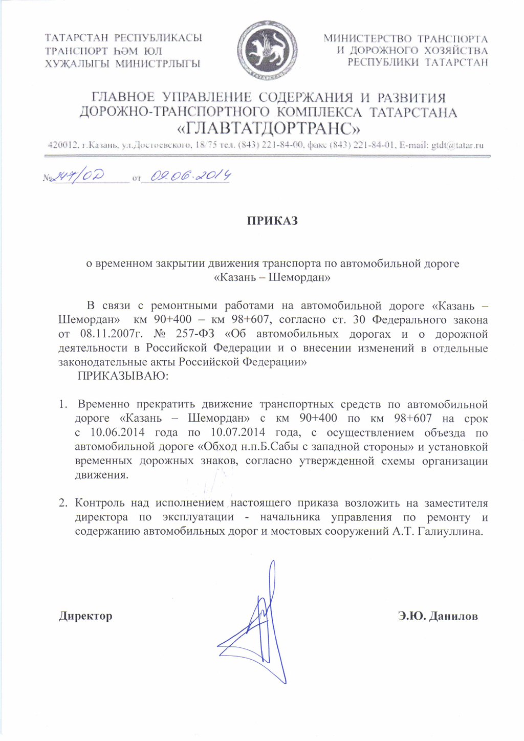 В связи с ремонтными работами временно, с 10.06.2014 по 10.07.2014, прекращается движение транспорта на участке км 90+400 – км 98+607 автомобильной дороги «Казань-Шемордан».