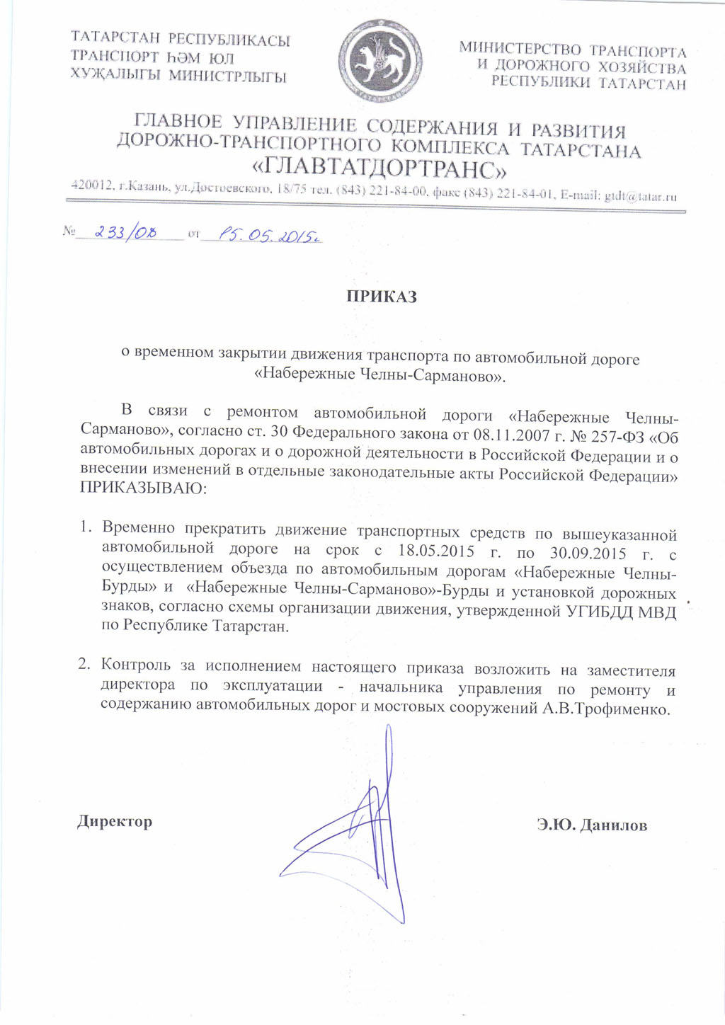 О временном закрытии движения транспорта по автомобильной дороге «Набережные Челны-Сарманово».