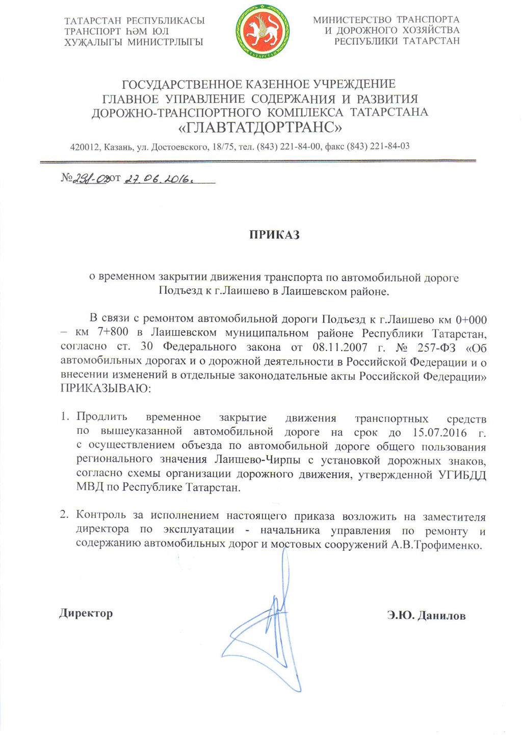 О продлении временного закрытия движение по участку а/д «Подъезд к г.Лаишево».