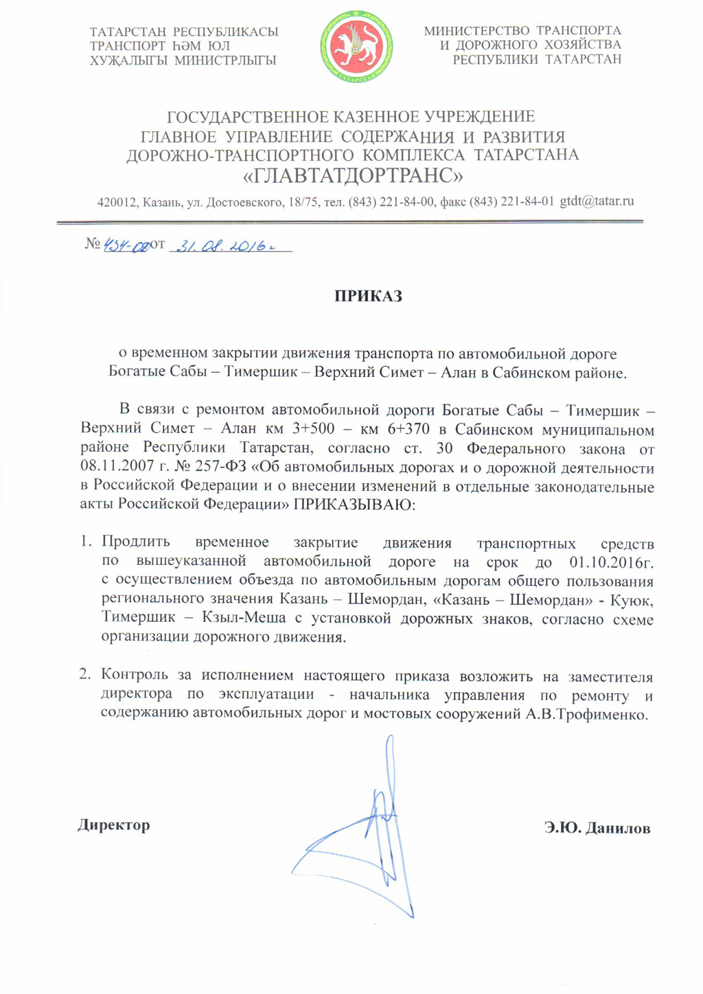 О продлении временного закрытия движения транспорта по автомобильной дороге Богатые Сабы – Тимершик – Верхний Симет – Алан.